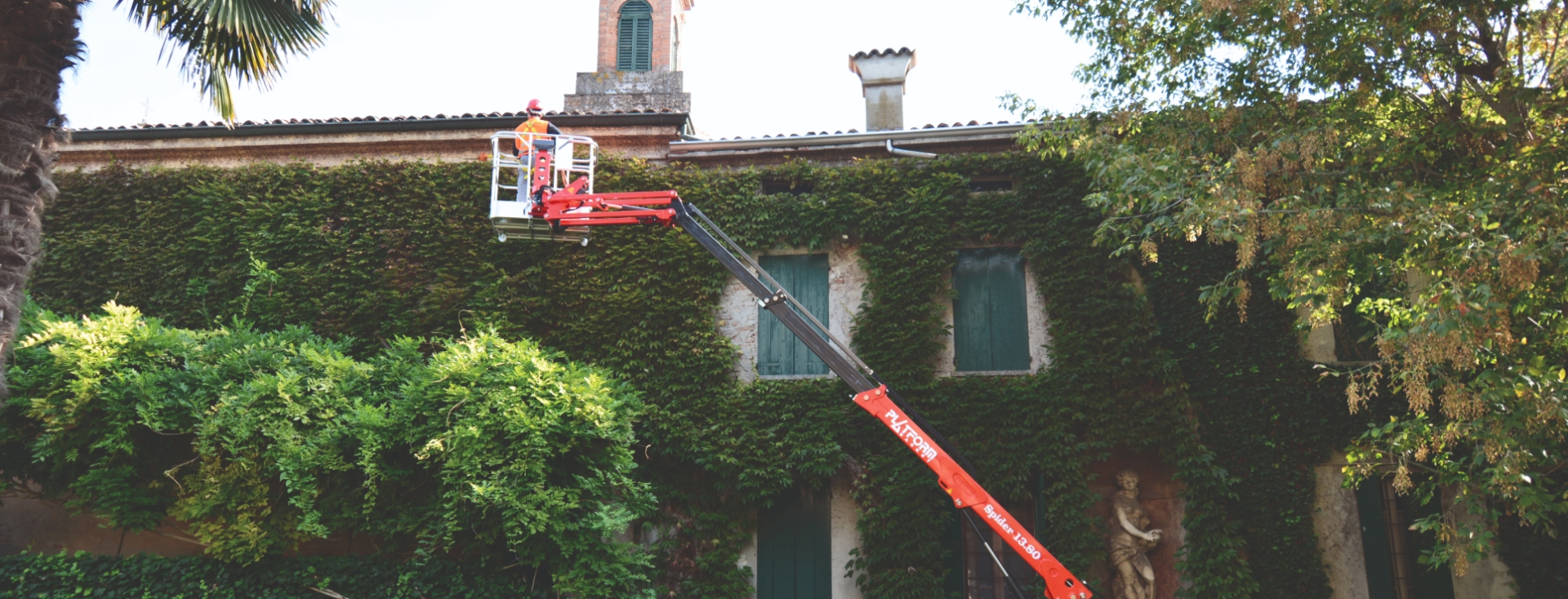 The Platform Basket spider aerial working platforms range also offers on-board selection of the charging power level depending on the availability of the electricity supply. In addition, lithium-ion battery-powered equipment can be used inside any environment. In fact, gas emissions are absent in lithium batteries, making it possible to recharge the platform safely anywhere in the establishment. Noise pollution is also notably cut down. Moreover, thanks to their compact size, Platform Basket spiders can move in small spaces and at the same time offer extremely stable and safe use, making them perfect for smaller scale property maintenance tasks. In fact, the absence of externally mounted hoses prevents them from getting caught and causing damage to things or the machine. Platform Basket spiders can also be fitted with non-marking tracks for mobility over delicate surfaces.